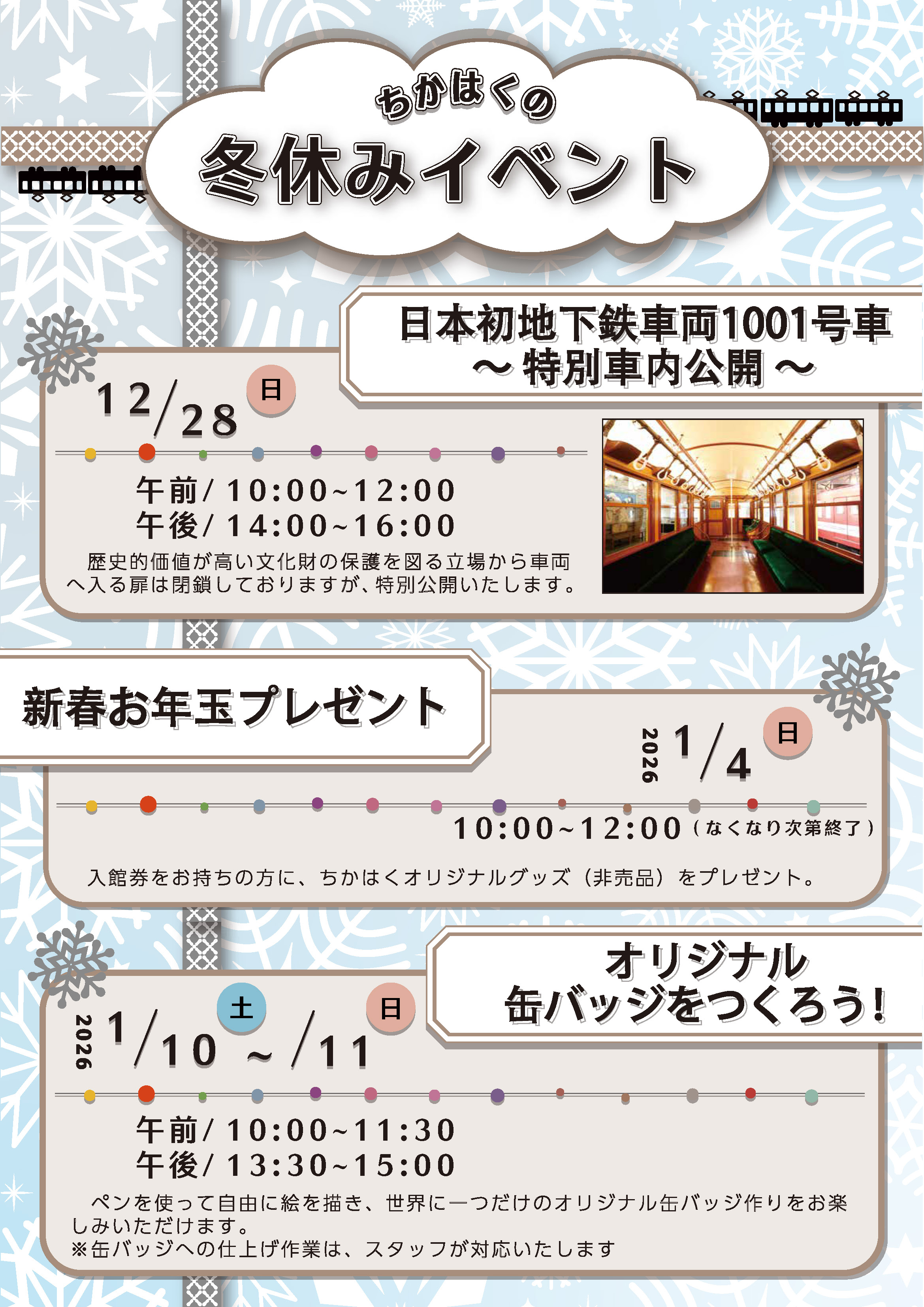 | 内 容 | 入館券をお持ちの方に、ちかはくオリジナルグッズ(非売品)をプレゼント。 |