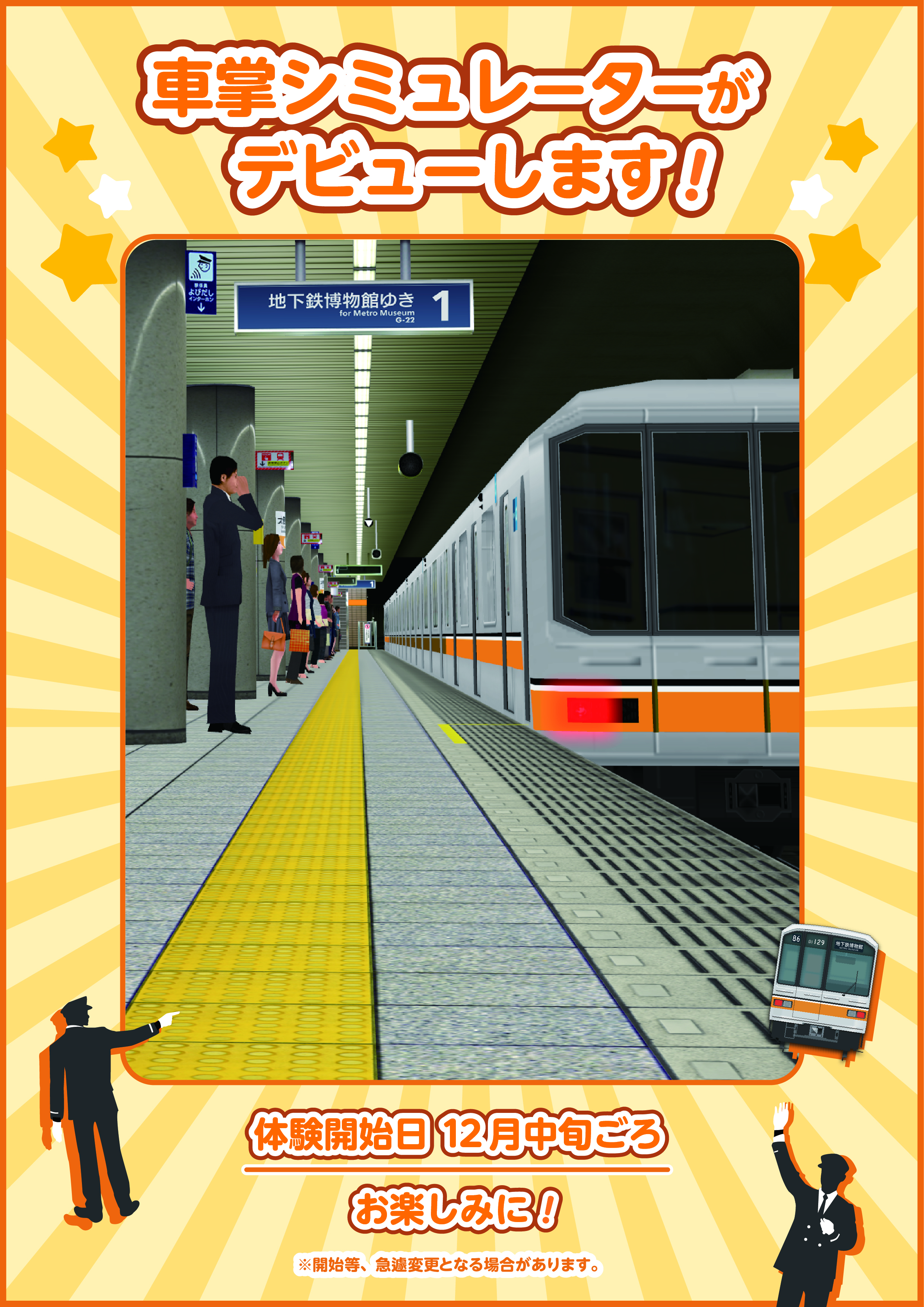 車掌シミュレーターがデビューします! 現在展示中の銀座線01系車両カットモデルが車掌シミュレーターとして生まれ変わります! 体験開始日は、12月中旬ごろを予定しています。詳しい情報は、今しばらくお待ちください。お楽しみに! ※開始日等、急遽変更となる場合があります。